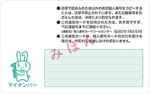 なお、令和2年5月25日施行のデジタル手続法により、通知カードは廃止され、施行日以降は通知カードに代わり「個人番号通知書」によりマイナンバーをお知らせします。