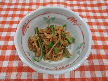 - 切り干し大根を水で戻し、水気を切り、食べやすい大きさに切る。ピーマンはせん切りにする。赤唐辛子は種を取り除き輪切りにする。