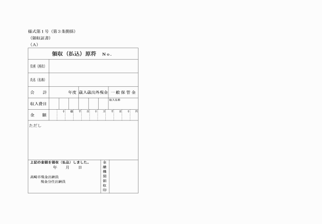 第3条 現金出納員又は現金分任出納員(高崎市財務規則(平成5年高崎市規則第7号)第179条に規定する現金出納員又は現金分任出納員をいう。以下同じ。)は、歳入歳出外現金(前条第3号に規定するものを除く。)を受領したときは、領収証書(領収(払込)原符、領収書、領収済通知書)(様式第1号)の領収書に、現金出納員にあっては高崎市公印規則(昭和56年高崎市規則第7号)第3条に定める現金出納員印を、現金分任出納員にあっては高崎市財務規則第31条に定める現金分任出納員の職印を押し、納人に交付しなければならない。