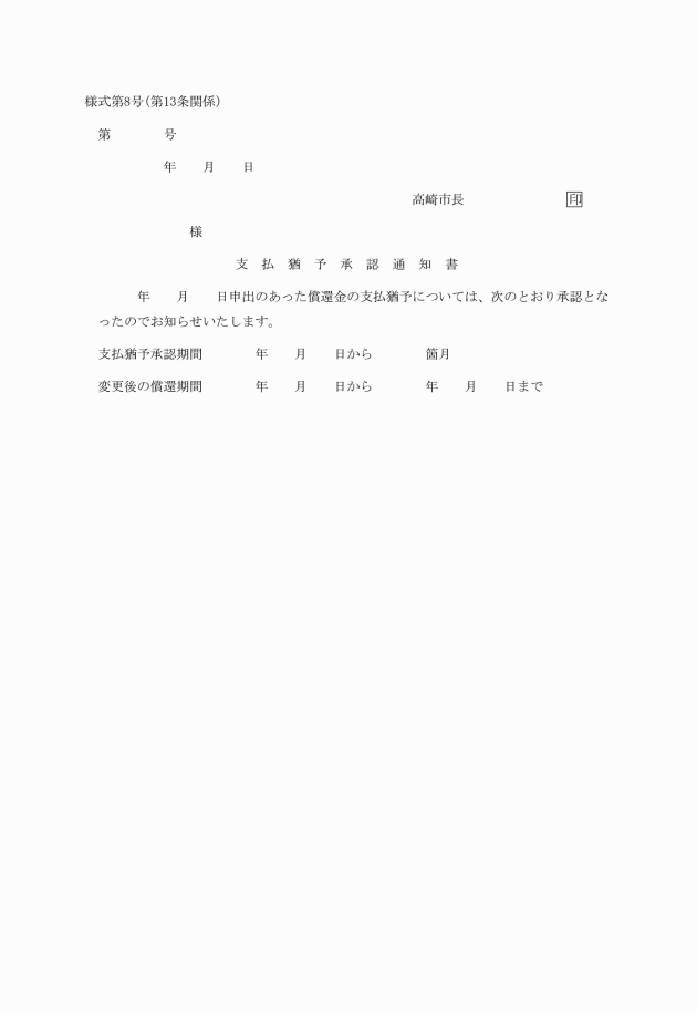 第13条 借受人は、償還金の支払猶予を申請しようとするときは、支払猶予を受けようとする理由、猶予期間その他市長が必要と認める事項を記載した申請書(様式第7号)を市長に提出しなければならない。