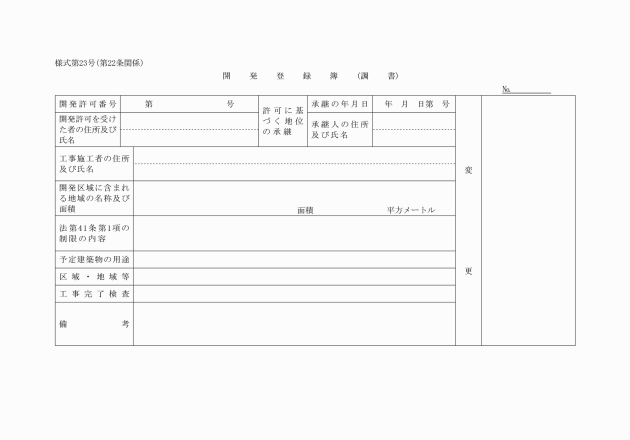 第22条 省令第36条第1項の規定に係る開発登録簿の調書は、様式第23号によるものとする。