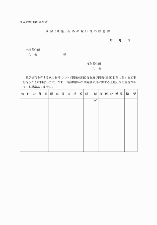 第4条 省令第17条第1項第3号に規定する法第33条第1項第14号の相当数の同意を得たことを証する書類は、開発(建築)行為の施行等の同意書(様式第2号)に同意した者の本人確認資料を添付しなければならない。
