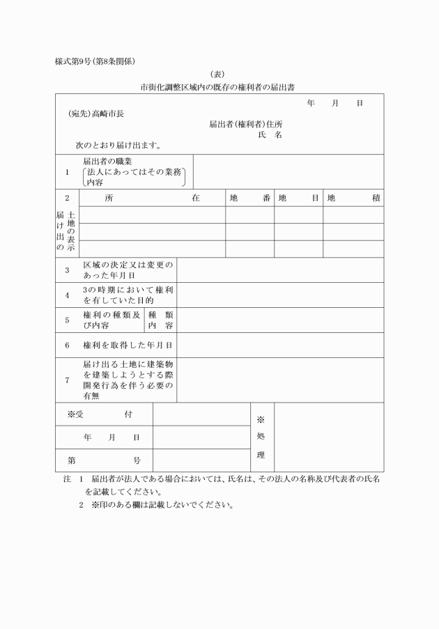 第8条 法第34条第13号の届出をしようとする者は、市街化調整区域内の既存の権利者の届出書(様式第9号)に次に掲げる図書を添付して市長に届け出なければならない。