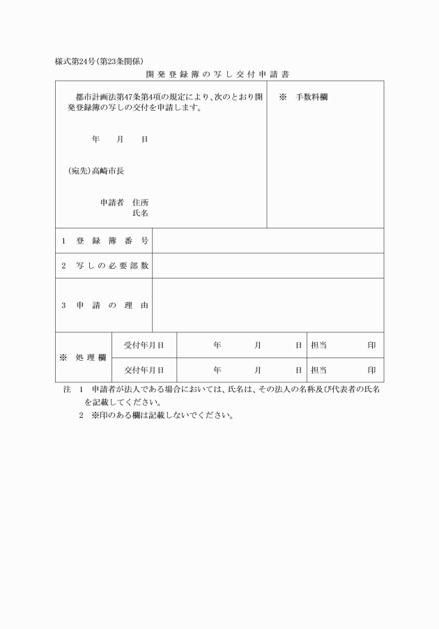 第23条 法第47条第5項の規定に係る開発登録簿の写しの交付を受けようとする者は、開発登録簿の写し交付申請書(様式第24号)を市長に提出しなければならない。