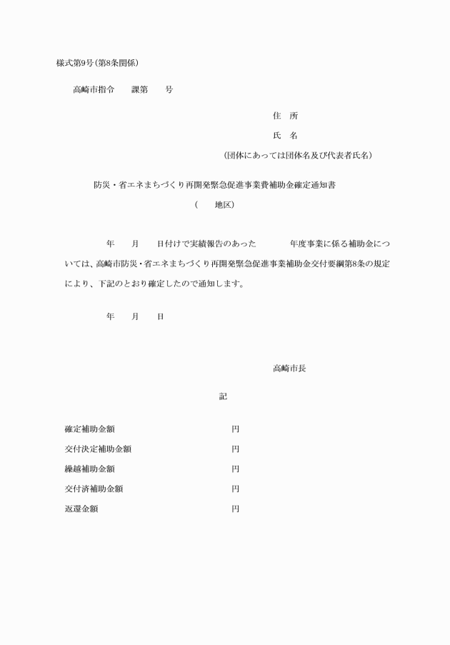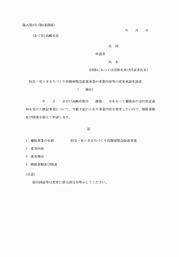 第4条 補助金の交付を受けようとする者は、防災・省エネまちづくり再開発緊急促進事業費補助金交付申請書(様式第1号)を、市長に提出しなければならない。