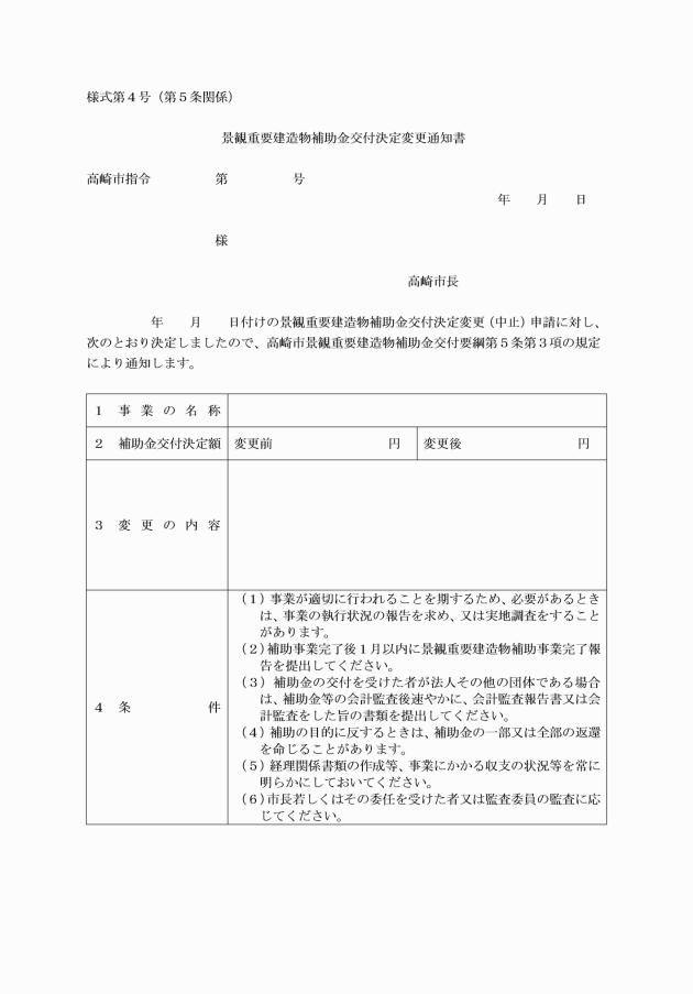 第6条 補助金の交付決定を受けた者は、事業の完了後1月以内に景観重要建造物補助事業完了報告書(様式第5号)を市長に提出しなければならない。