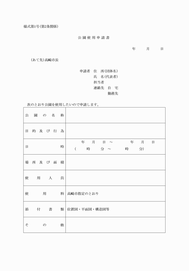 第5条 都市公園法(昭和31年法律第79号。以下「法」という。)第5条第1項若しくは法第6条第1項又は条例第18条第1項前段の規定により公園施設の設置若しくは管理又は公園の占用の許可(以下「設置許可等」という。)を受けようとする者は、それぞれ様式第4号、様式第5号又は様式第6号による申請書を市長に提出しなければならない。