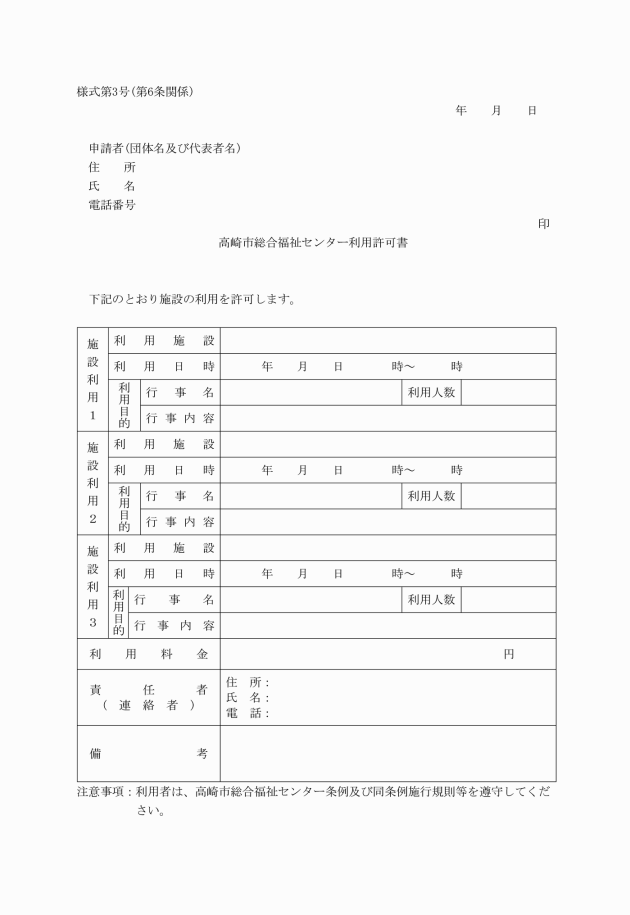 第5条 条例第7条第1項前段の規定による許可(以下「利用許可」という。)を受けようとする者は、高崎市総合福祉センター利用申請書(様式第1号。以下「利用申請書」という。)を指定管理者に提出しなければならない。