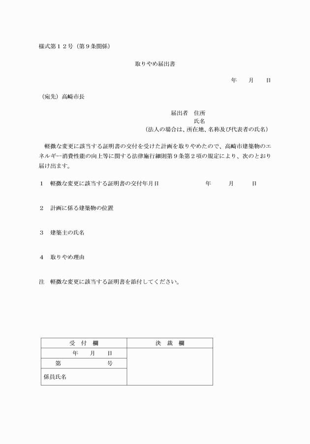 2 省令第13条又は第28条の規定による軽微な変更に該当する証明書の交付を受けた者は、建築物エネルギー消費性能確保計画又は建築物エネルギー消費性能向上計画を取りやめたときは、速やかに、取りやめ届出書(様式第12号)2部に、当該軽微な変更に該当する証明書を添えて、市長に提出しなければならない。
