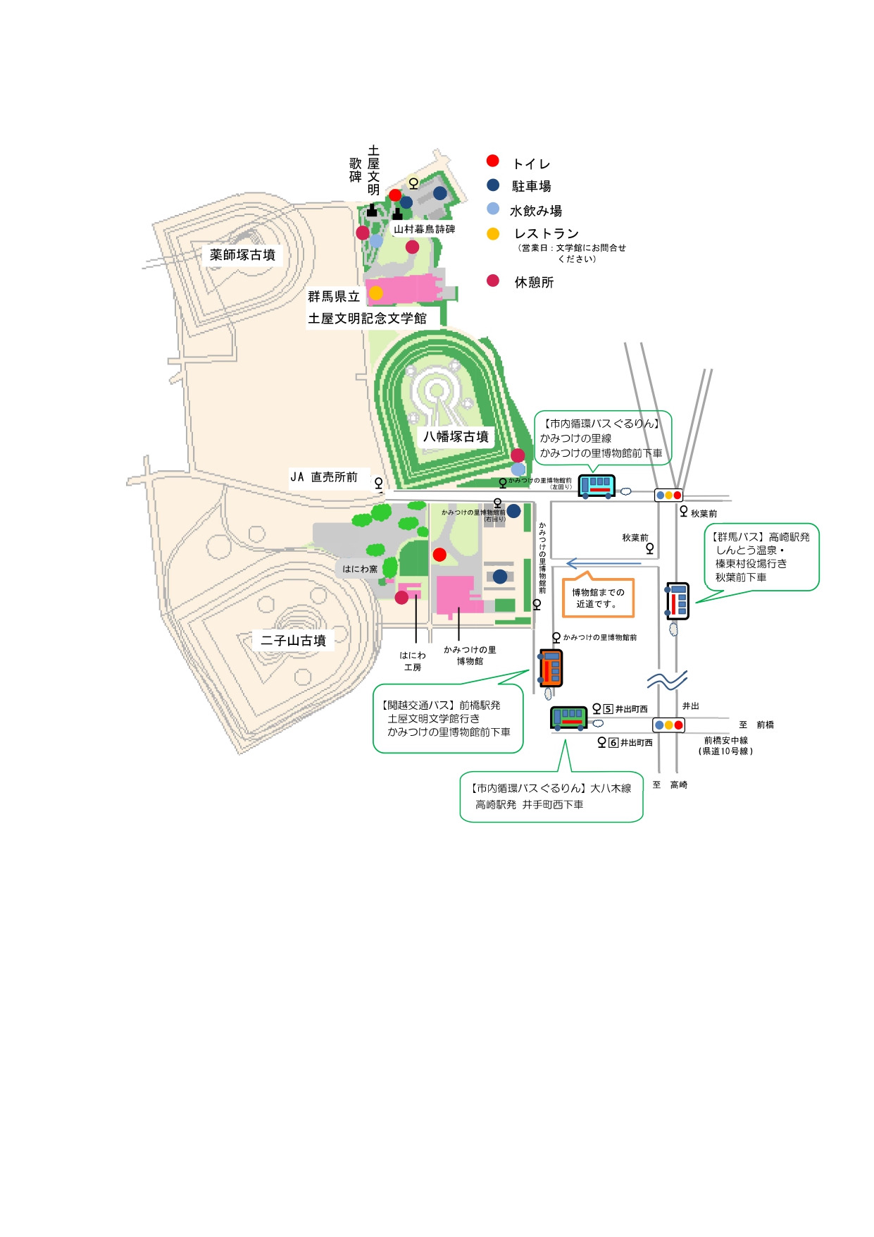 当館から徒歩約1分、バス停「かみつけの里博物館前」乗車、前橋駅着