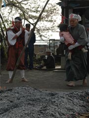 火渡りは、まず行者による神を呼ぶ言葉やお払いから始まり、続いて薪に火が付けられます。その後お祈りが続き、下火となってから塩をまき、道を開き、御幣を持った行者が渡った後、一般の人々も渡ります。