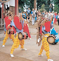 演目は、悪魔祓い、広庭、岩、子持ち、神社までの行き帰りに神楽堂(輿)をかついで練り歩く時の道中囃子がある。(写真左)