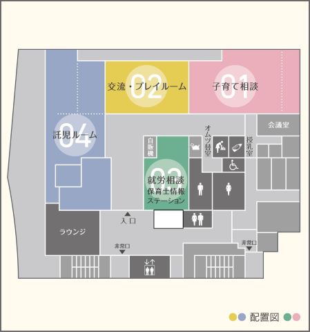 交流・プレイルームでは乳幼児向けの簡易な遊具、おもちゃなどで、遊んだり、休憩したり、気軽にご利用ください。
