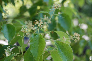 樹高10~20メートルの落葉高木。花は黄緑色で4~5月に咲く。雌雄異株。果実は直径5~10ミリで房状になる。熟すと赤紫色になる。