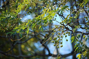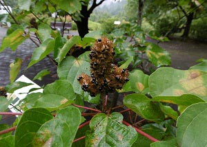 近年になって染料として使われはじめた。8月から9月ごろの枝葉をすぐ煮出し、肌色・金茶色・緑茶色などを染める。(3月29日撮影)