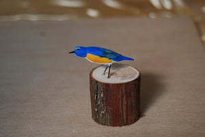 丸い棒から小刀を使って作った小さな鳥は、本格的なバードカービングとはちょっと違って、短い時間でできるのも魅力。木の実に乗せたり竹に留めるなどして、足の位置なども工夫しました。色を塗るとぐっと鳥らしい表情になりました。