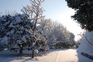 写真は、雪による樹木への影響を確認するために園内巡廻を兼ねて撮影。木々にはほとんど影響がなかったのでよかったです。