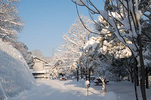 この日は早朝から雲のない素晴らしい快晴。太陽の光で雪が輝き園内は感動的な雪景色になりました。昨日までの冬枯れの景色から一転して水墨の世界。普段見慣れた園内の景色も素晴らしい景色になりました。