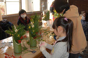 講習会は、簡単な説明を受けたあとに、親子で協力しながら竹を切りました。松やウメなどの飾り付け方なども指導を受けながら、太い竹の中に飾り付けをしました。