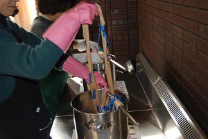 はじめに、染料のアカネの抽出や、ミョウバンの媒染液を用意などしてから染色に入りました。