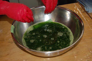大きく育ったアイを使って、夏休みの8月に藍の生葉染を行います。絹スカーフなどが爽やかな水色に染まり、夏休み限定の染色体験になっています。