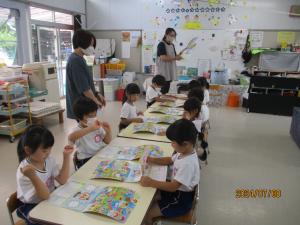 野菜の収穫では、実際に子どもたちの前で野菜を切って、切り口を見たり香りをかいだりしました。子どもたちは、普段食べている野菜でもじっくり見ることはなかなかありません。その後、給食主任が、野菜に関する読み聞かせをしてくださいました。夏野菜を食べるとどんな効果があって、健康によいのかを話してくださいました。野菜について学びの多い有意義なひと時を過ごしました。