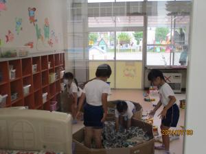今日は、水遊びの他に虫の世話をしたり好きなものを製作したりして遊びました。年少さんのお部屋では、年長さんが来て一緒に遊びました。