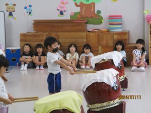 午後は、年長さんと年中さんが和太鼓の練習をしました。夏休みを目前に控え、気合の入った練習をしました。子どもたちは、集中力もあり、そろった演奏になってきました。和太鼓の重厚な響きがずんずんとお腹に響きます。また、掛け声をかける年中さんもしっかり声が出ていて、聞いていて気持ちがよいです。本番が本当に楽しみです。