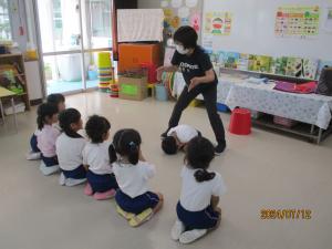 今日は、朝から曇り空で意外と気温が上がりませんでした。子どもたちは、保育室で好きな遊びをたくさんしました。年少さんは、電車に乗って園内をお散歩です。年長さんは、夏休みの過ごし方と「早寝、早起き、朝ごはん」について説明を受けていました。子どもたちは、夏休みをとても楽しみにしている様子が伝わってきました。年中さんは、ALTの先生が来園し、英語を使って一緒にままごとやバンパイアごっこをして遊びました。