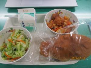 本日の献立は、夢ロール、クロケット、フレンチサラダ、コンソメスープ、牛乳です。今日の献立は、パリオリンピック開催を祝ったフランスのお料理、クロケットがでました。