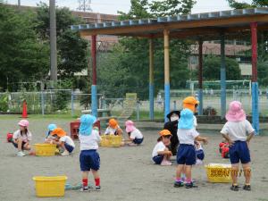 曇り空でしたが、明日からまた、梅雨空がもどってくる予報なので、梅雨の合間をぬって、水遊びをしました。子どもたちは、水鉄砲で遊んだりペットボトルで製作したお手製のシャワーをしたりして、水遊びを楽しみました。